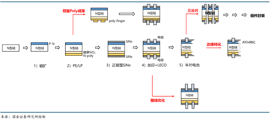 1)边缘钝化:预计提效 0.2%+现有组件普遍以半片电池的形式封装而成,因此基于整片硅片沉积功能层之后,需要通过激光切割得到半片电池。电池片切割后产生新的表面,而新表面往往存在大量悬挂键、杂质、晶格缺陷等复合中心,导致效率损失。边缘钝化是采用原子层沉积(ALD)技术指在半片电池的新鲜表面沉积 AlOx 钝化层以减少