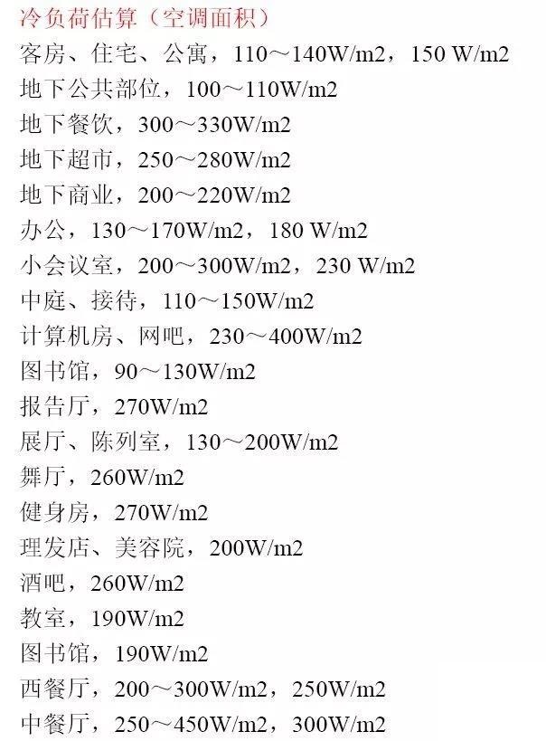 2、冷热负荷估算参考值