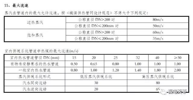 ③蒸汽及热水管道最大流速参考值