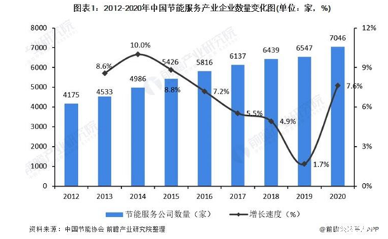 中国节能服务行业企业数量与项目投资额呈上升趋势 2012-2020年,全国从事节能服务业务的企业数量逐年上升,2020年增速有所提升。根据中国节能协会发布的节能服务产业《回望2020》产业篇,截至2020年底,全国从事节能服务的企业有7046家,年增长率为7.6%。